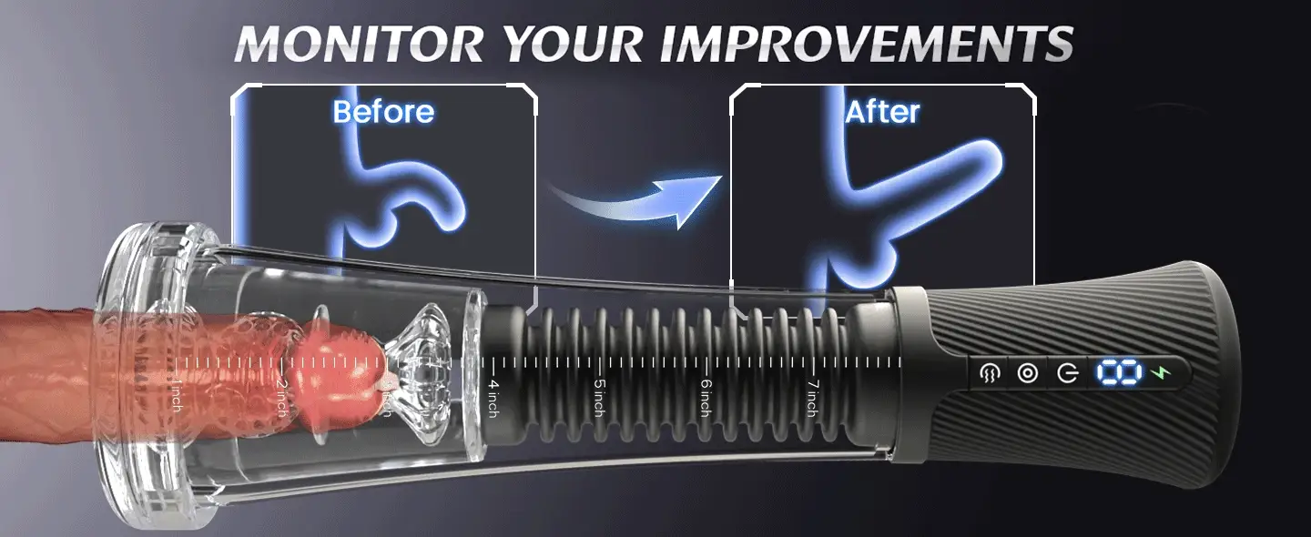 High-Elasticity Spring Male Vibrator & Extra-Long Transparent Cup: The 4.3" spring offers strong elasticity, allowing the glans to push and stimulate for enhanced training. The 8.7" extra-long pump (vs. 8'' on the market) fits most sizes. The transparent cup with measurement lines makes the enlargement process clear and visible.