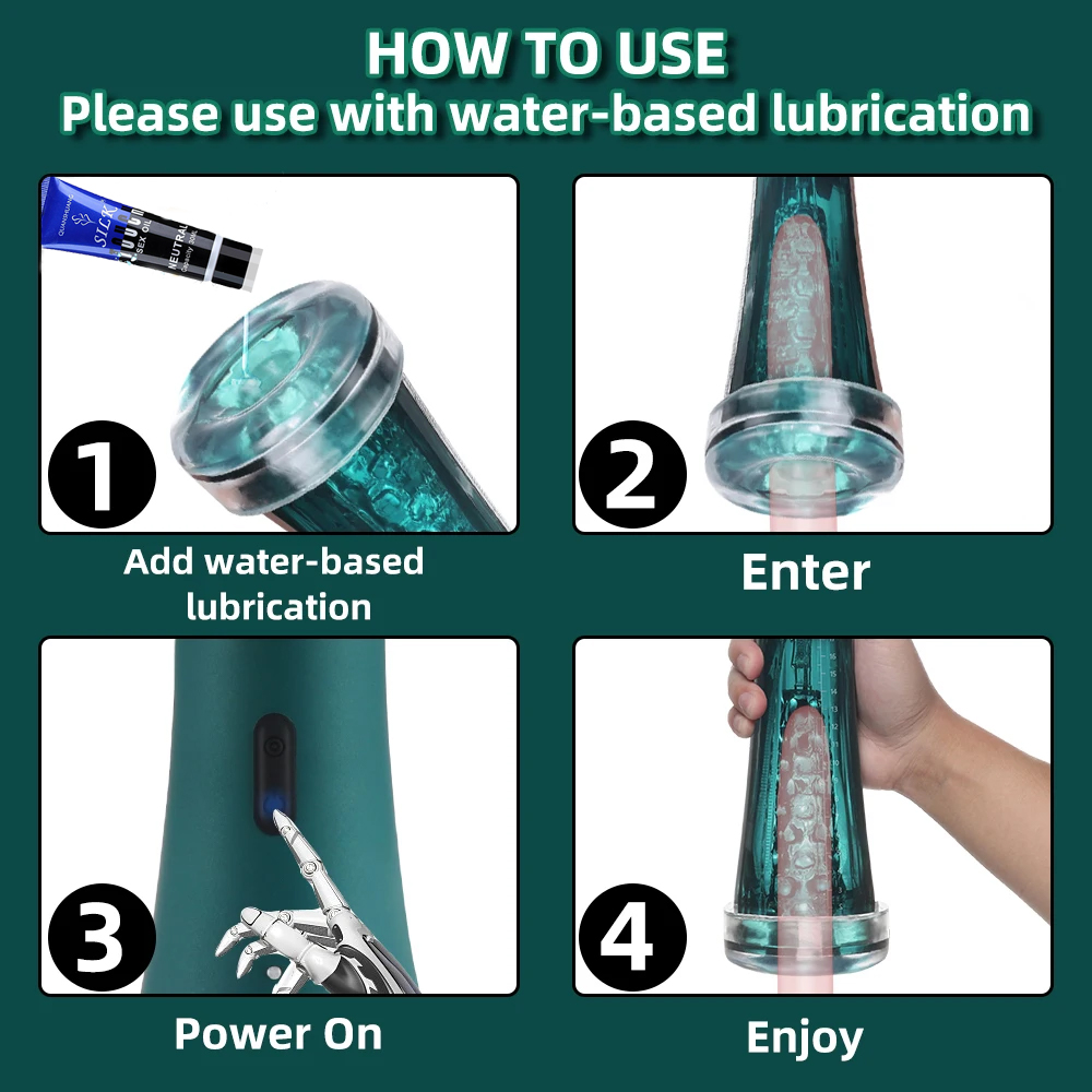 Best Experience Step by Step:Step 1 – Pour in lubricant, Step 2 – Insert your penis, Step 3 – Press the power button, Step 4 – Sit back and enjoy the ride to climax.